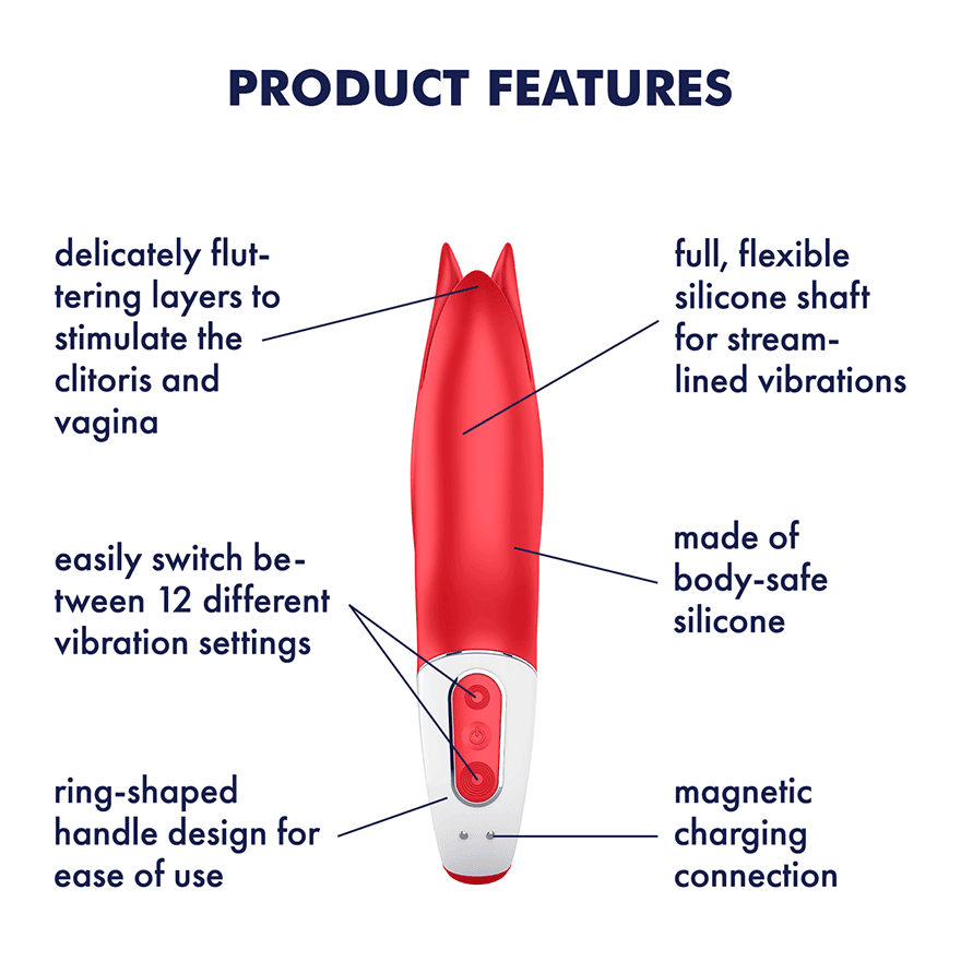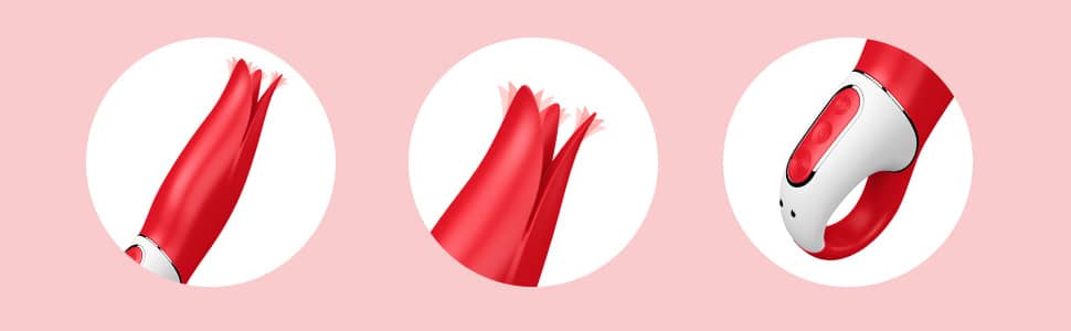 Power Flower Vibrator with the vibrations of its fluttering petals will have your love bud trembling on the winds of desire. The Power Flower was created to make your bud bloom with pleasure and a flexible shaft made of supple material and a narrow, split tip. This results in versatile stimulation possibilities, because you can use the Power Flower both vaginally, as well as for external stimulation, by letting its soft petals dance around your clitoris. On the practical retaining ring with integrated control panel, you can find your favorite program intuitively at the push of a button and at the same time have a firm grip on the flowery pleasure bringer, even when things get especially hot and wet. The 12 particularly powerful vibration programs are made up of 6 intensities and 6 tingly rhythms. The powerful motor distributes the vibes ideally over the entire shaft, so they intensely stimulate you from top to bottom. Thanks to its waterproof design, the Power Flower also invites you to enjoy sensual pleasure in the shower or in the bath. Rechargeable, USB cable included.